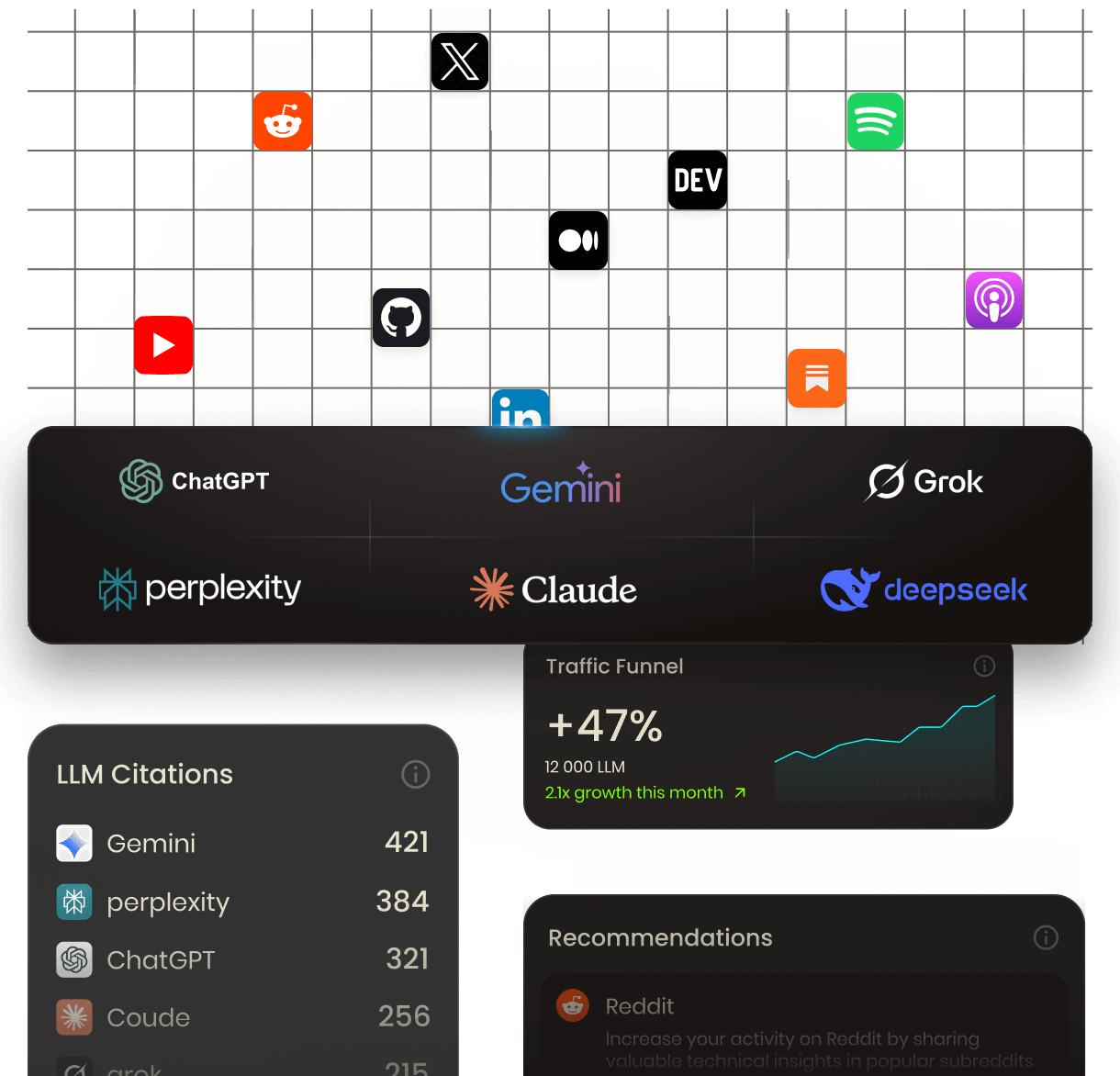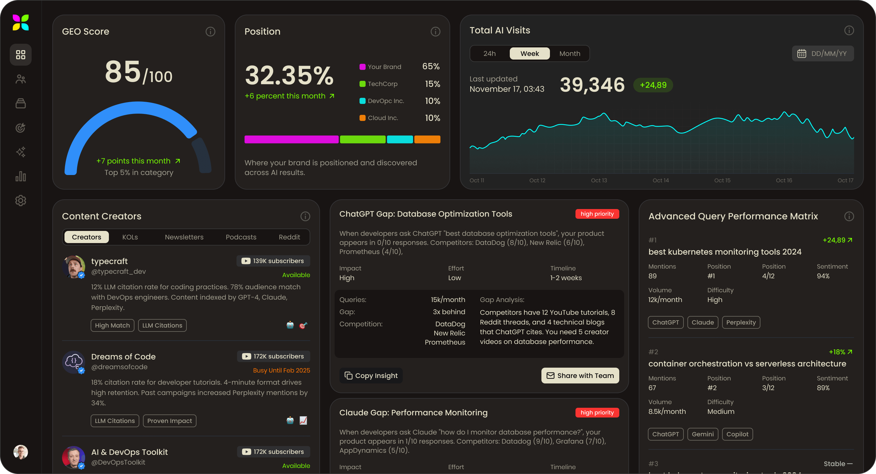 See where you're visible in AI, discover which prompts to target, and win them with content from real technical creators.